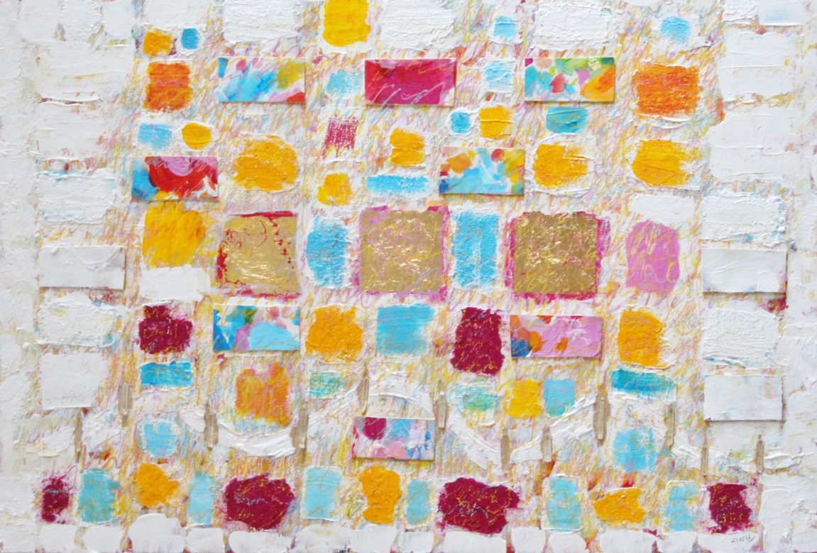 Mischtechnik (Acrylfarben, Kreide, Pigmente, Sand, Bergkristall, Blattgold, Karton) 82 x 57 cm