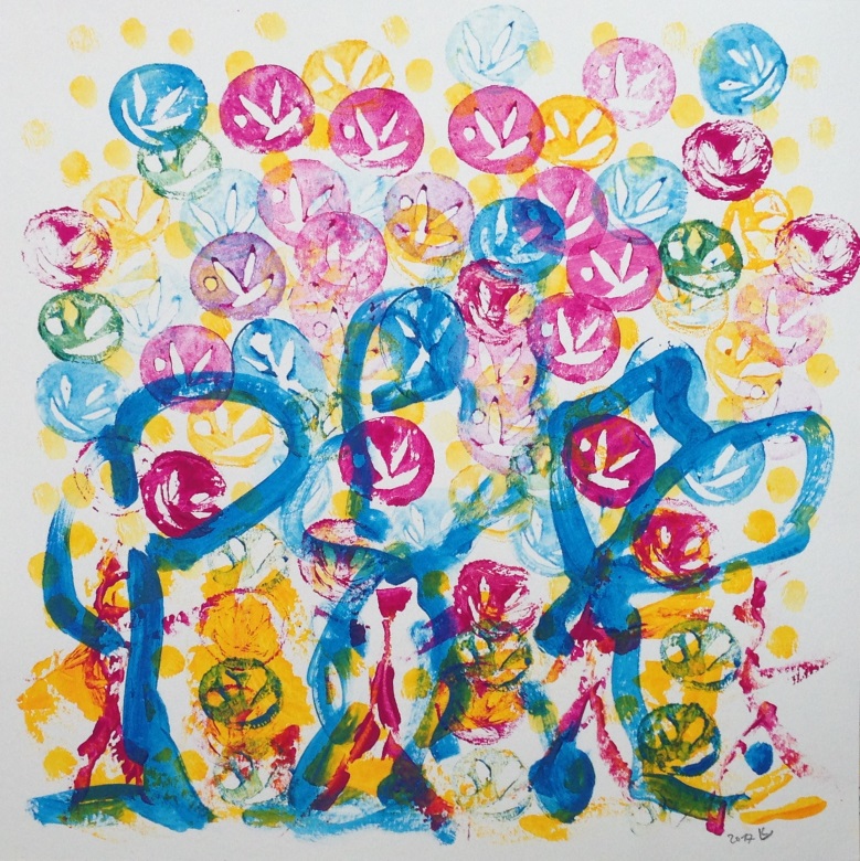 Mischtechnik: Acrylfarben, Kartoffeldruck auf Buettenpapier, 40 x 40 cm