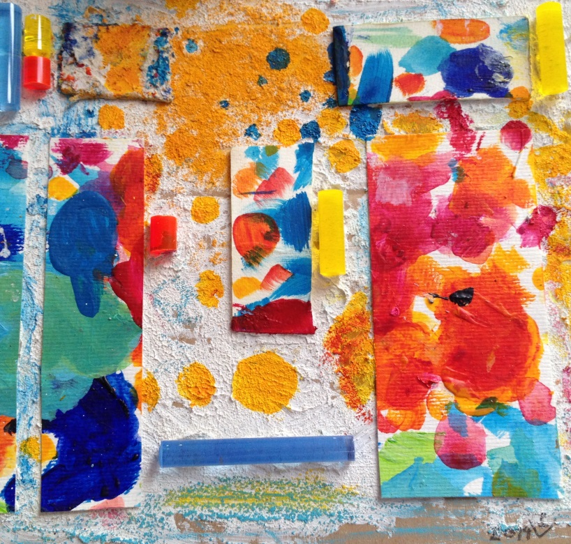 Mischtechnik: Collage, Pappe, Buettenpapier, Acrylfarben, Sand, Pigmente, Acrylglasteile, 28 x 28 cm