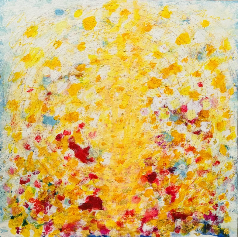 "Energizing Light" Mischtechnik (Acrylfarben, Kreiden, Acryltuschen, Pigmente, Sand, Blattgold) 80 x 80 cm