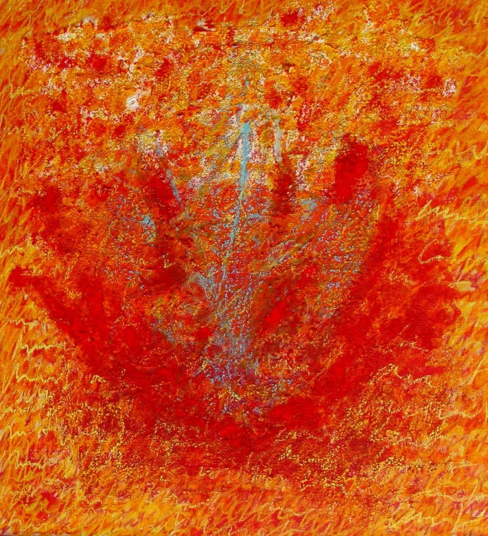 "Heart opening Fire" Mischtechnik (Acrylfarben, Kreide, Pigmente, Sand, Bergkristall), 40 x 43 cm
