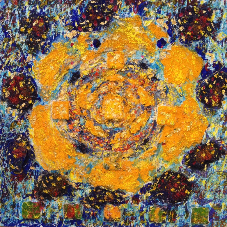 "Universe of Light" Mischtechnik (Acrylfarben, Kreide, Pigmente, Sand, farbloser Calcit, Blattgold), 40 x 40 cm