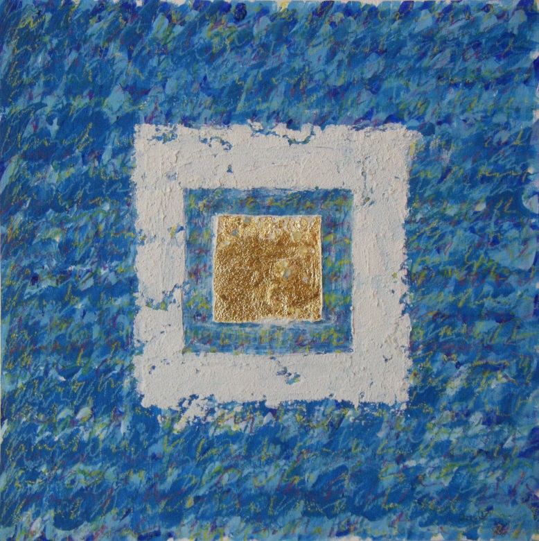 "Windows of blue Light" Mischtechnik (Acrylfarben, Kreide, Pigmente, Sand, Bergkristall, Blattgold) 40 x 40 cm