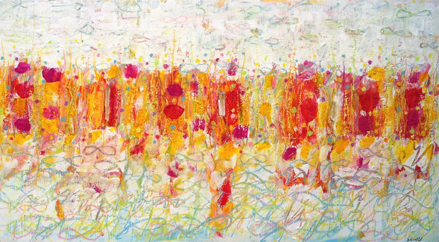 "Licht-Farbklang" Mischtechnik (Acrylfarben, Kreide, Pigmente, Sand, Bergkristall, Blattgold), 63 x 35 cm