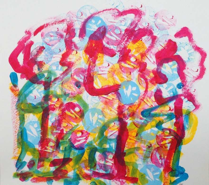 Mischtechnik: Acrylfarben, Kartoffeldruck auf Buettenpapier, 40 x 40 cm