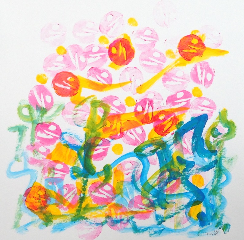Mischtechnik: Acrylfarben, Kartoffeldruck auf Buettenpapier, 40 x 40 cm