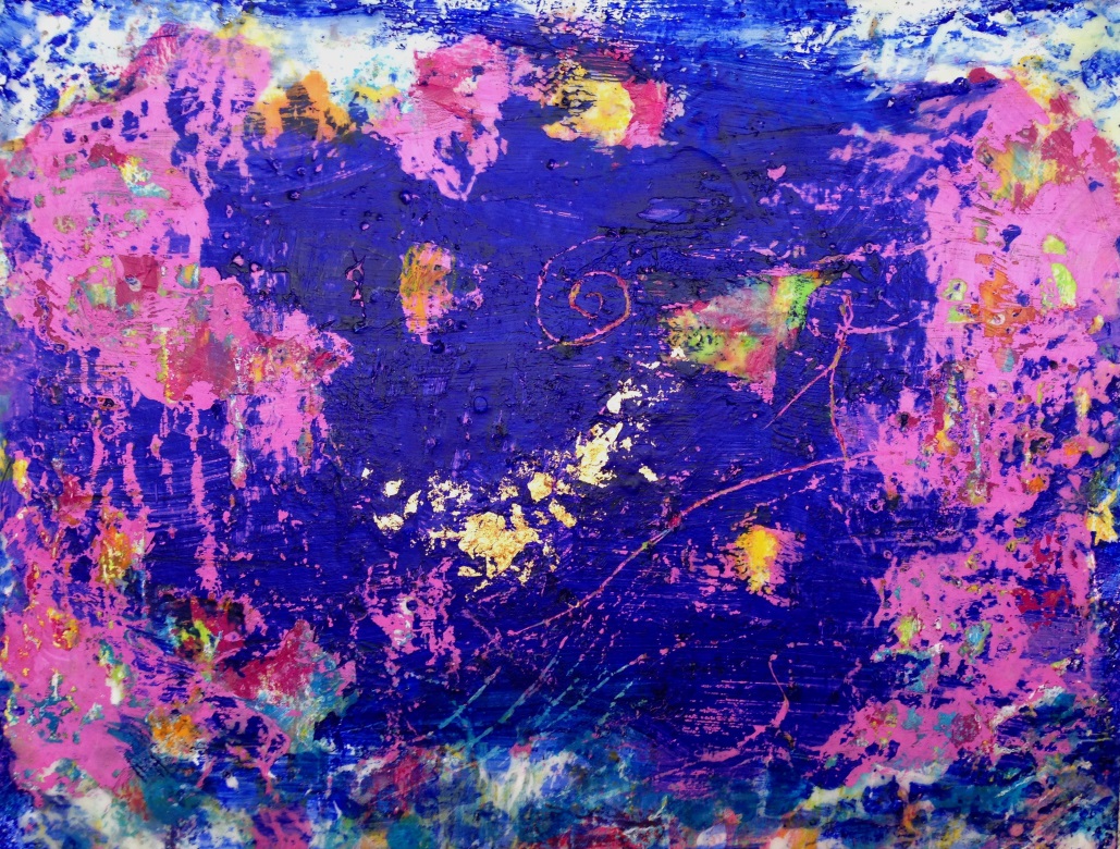 "Through Space and Time", Acrylfarben, Kreide, Pigmente, Blattgold, Wachs auf Holz, 54 x 46 cm