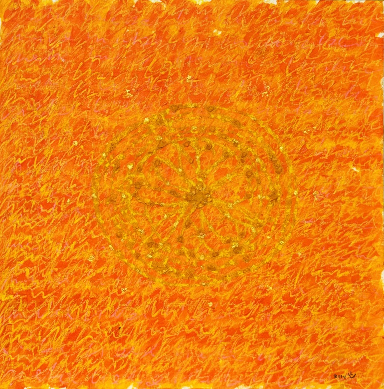 "Center of Light" Mischtechnik (Acrylfarben, Kreiden, Pigmente, Sand, Blattgold, Bergkristall) 40 x 40 cm