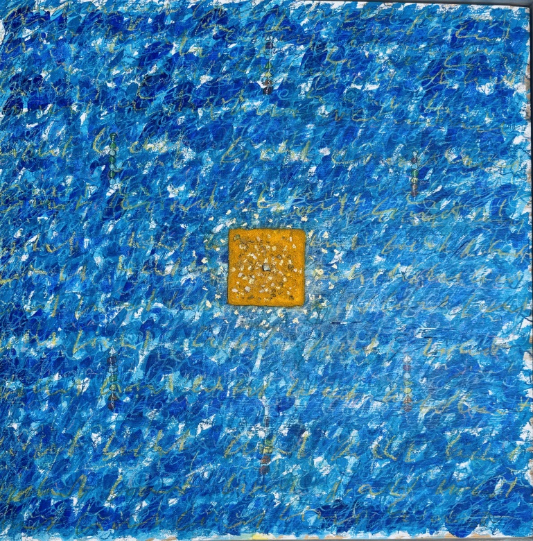 "Blue Kaleidoskope" Mischtechnik (Acrylfarben, Pigmente, Sand, farbloser Calcit, Blattgold) 65 x 65 cm