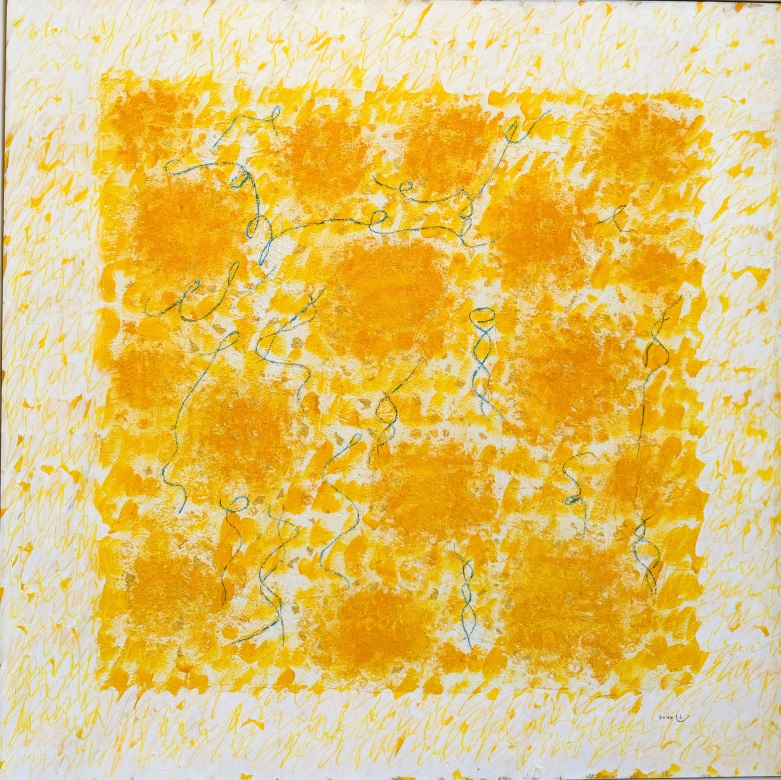 "Clouds and Light" Mischtechnik (Acrylfarben, Kreiden, Pigmente, Sand, Blattgold, Bergkristall) 80 x 80 cm