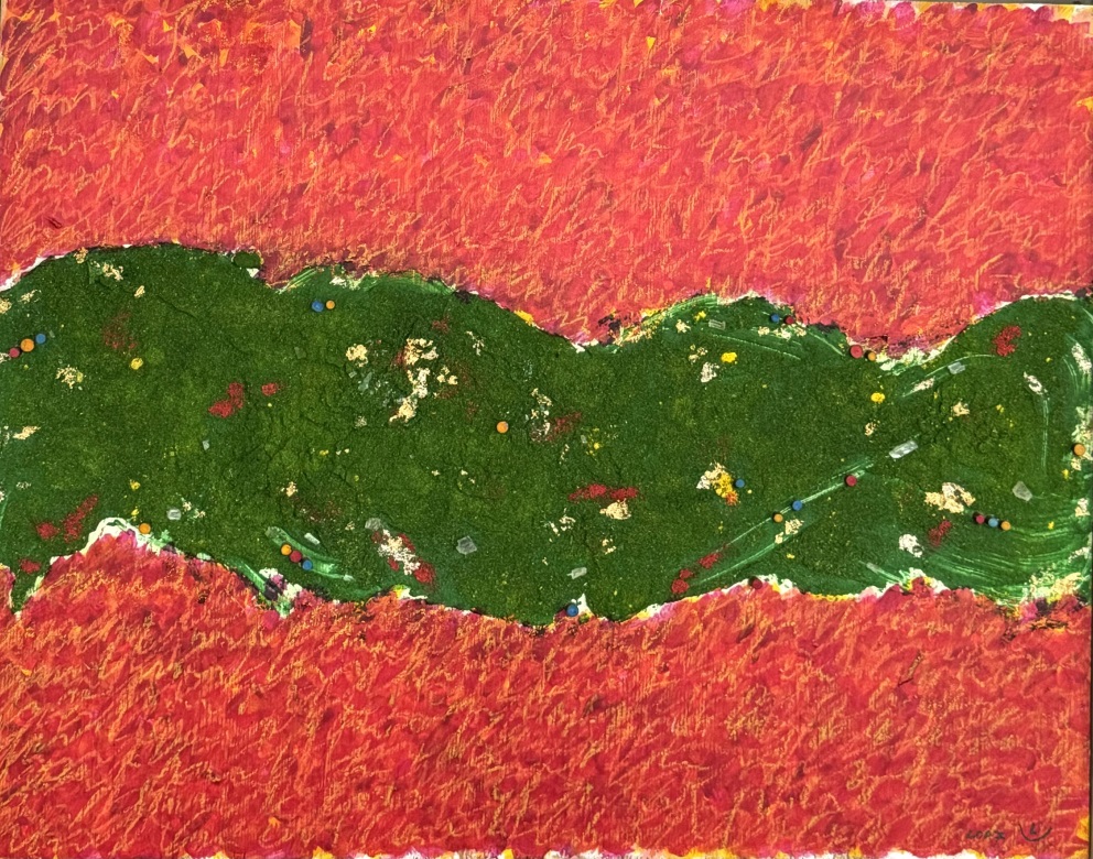 "Radiance of Earth" Mischtechnik (Acrylfarben, Kreiden, Sand, Pigmente, Holzteilchen, farbloser Calcit, Blattgold) 46x 37 cm